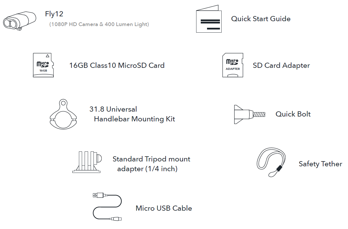 Firstly, let’s check to see if you have all of the goods. Your Fly12 should come with the following: